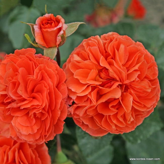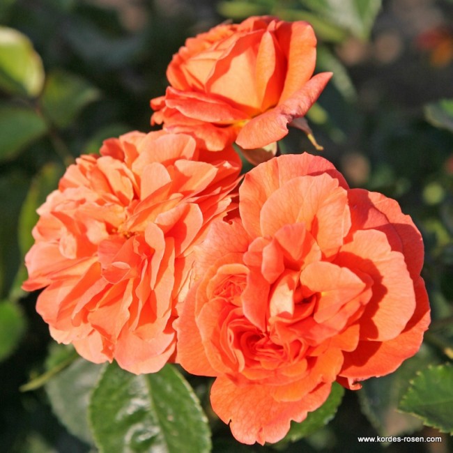 Väga kahekordsete, nostalgilise kujuga ja alati kobaratena paiknevate keskmise suurusega (7-8cm) õite värvus on tõeliselt oranž. Värvus on stabiilne isegi pideva päikesevalguse käes. Lehed tumerohelised, keskmised. Tänu väga tervele lehestikule on hea ja kergesti hooldatav valik. Kasv on püstine ja kompaktne.